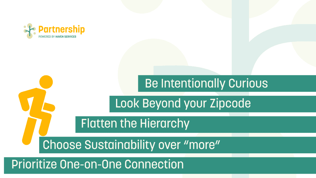 A core tenet of the Partnership Program is ensuring that collaboration is equitable, not dominated by the largest players. Tasha addresses this power balance by intentionally flattening the hierarchy within her community.